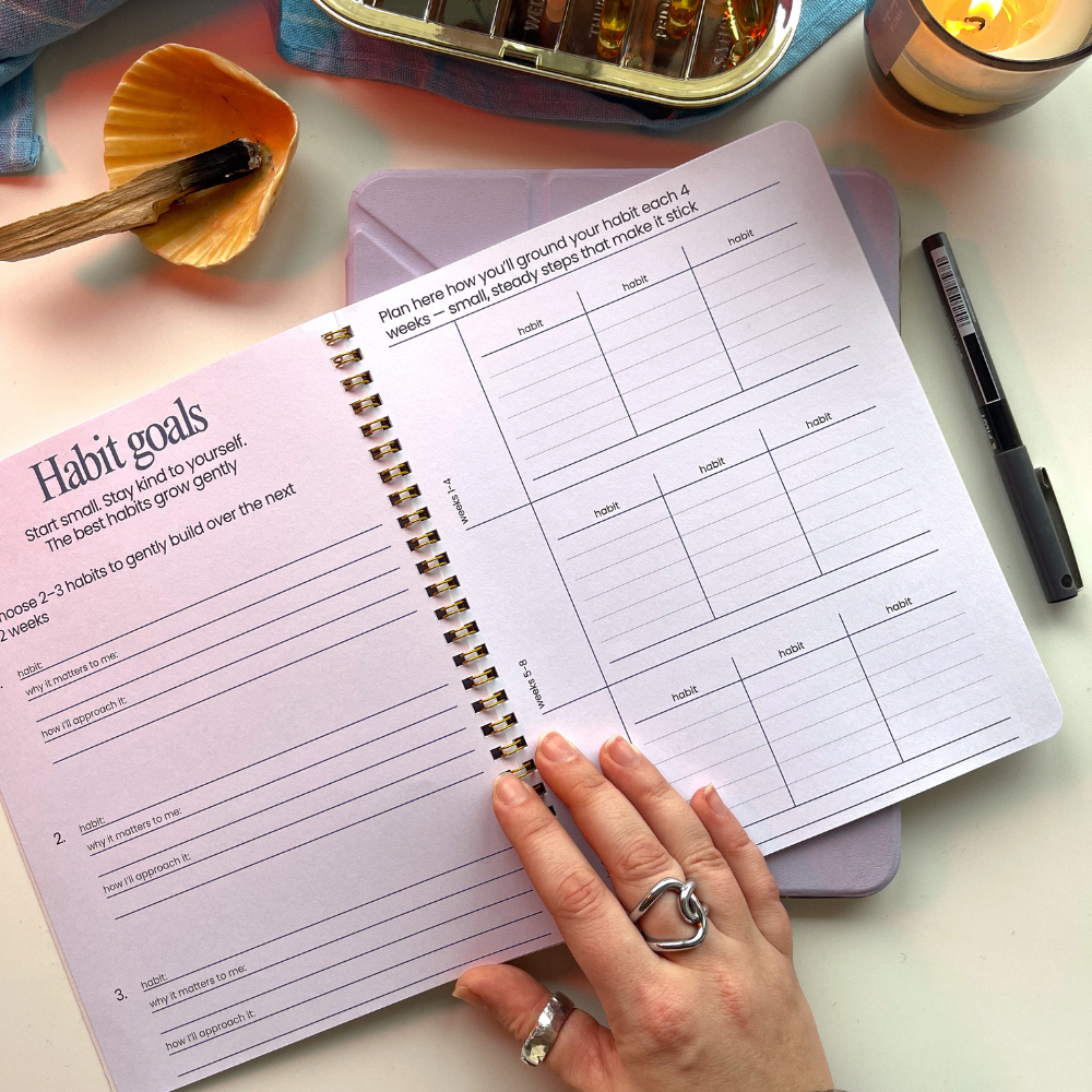 Set your habit goals and why they matter, then map your approach in gentle 4 week chapters. Each week includes a simple tracker, a dedicated vitamins, pills check in, a water tracker, a to-do list, notes, and next week planning, plus reflection prompts to help you carry forward what feels good.